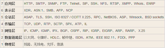 每层协议都有一些具体实现, 直接看下面的表格和图片.